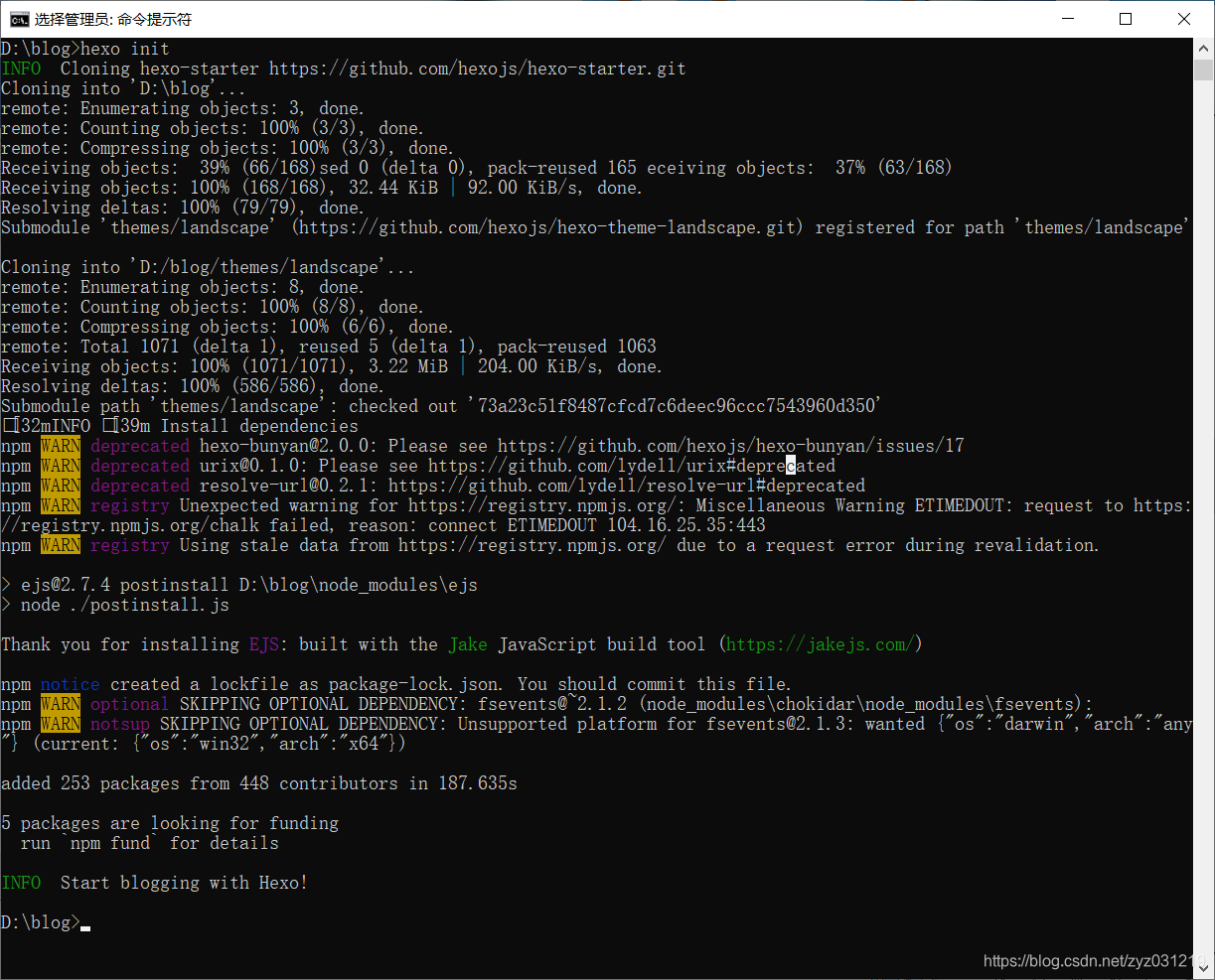 之后所有cmd命令操作都是在此目录下完成, - hexo init初始化博客,如下: