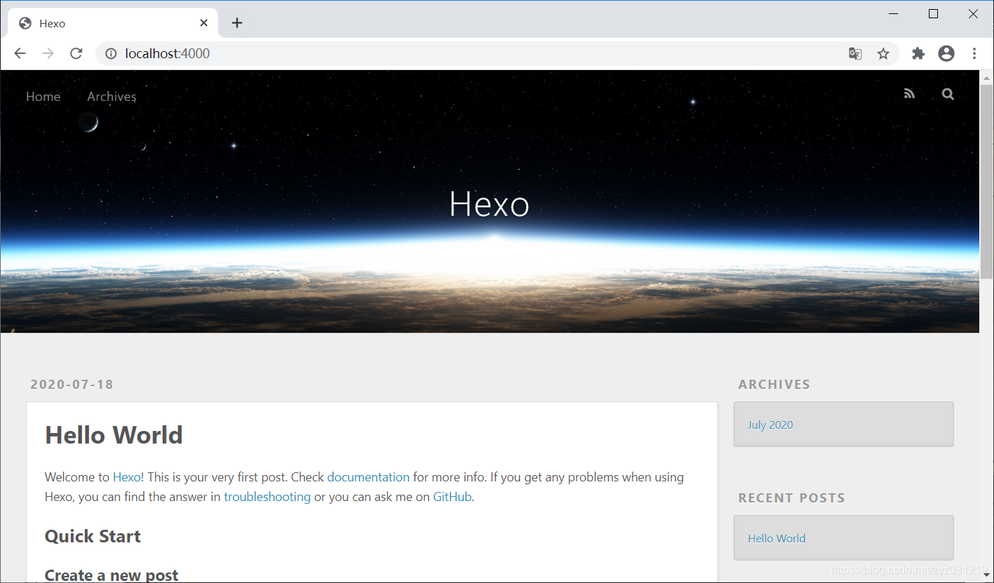 此时只是默认主题,然后我们修改个个性点的主题,可以在hexo官网查看选择自己喜欢的一款下载,