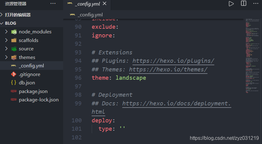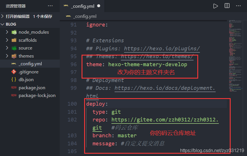 然后修改根目录下的配置文件 _config.yml(这里有两个同名配置文件,blog下的是根目录配置文件,主题matery里的是主题配置文件)