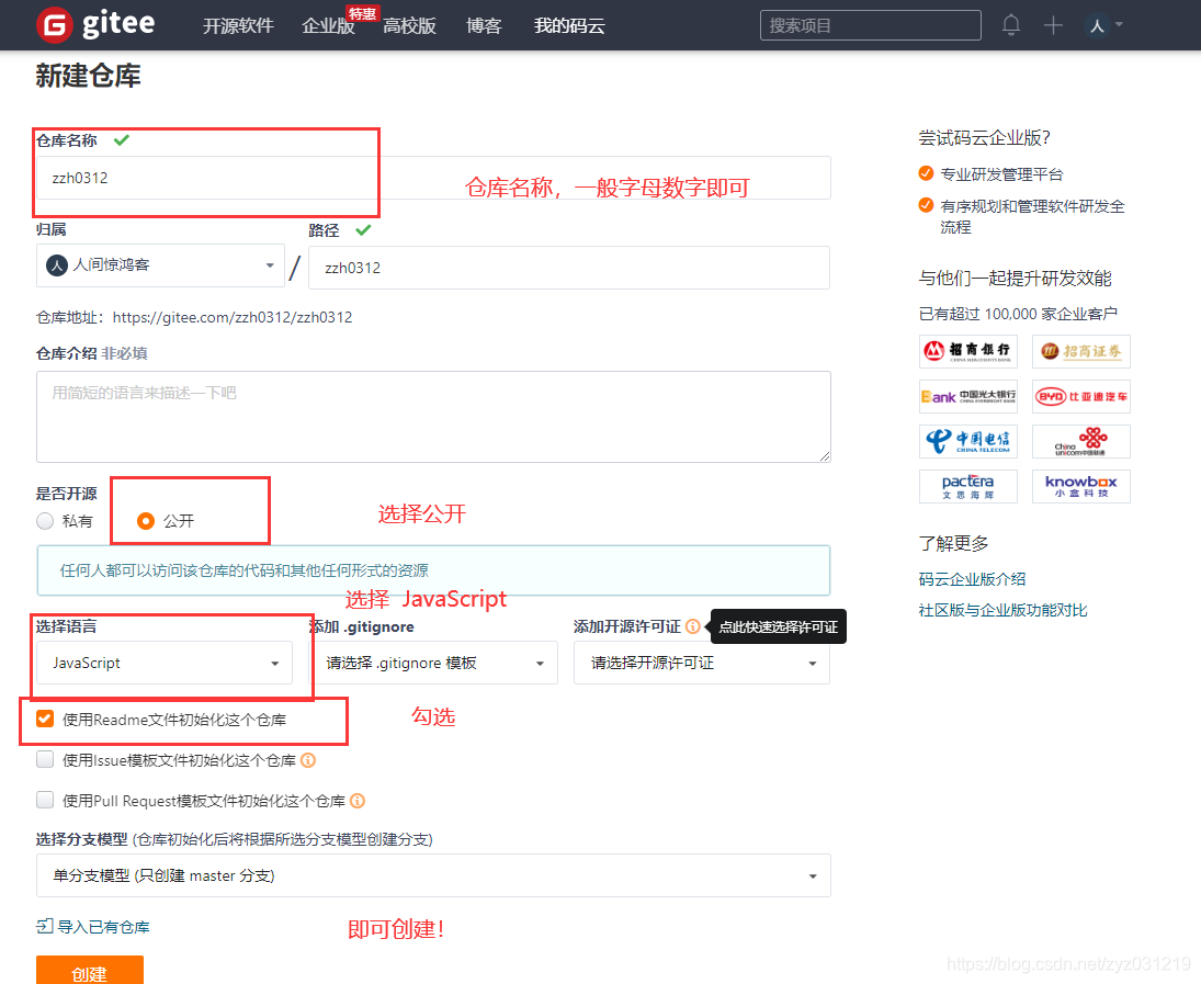 - 首先注册码云账号并完成手机号绑定(就是普通注册流程),随后进入创建仓库: