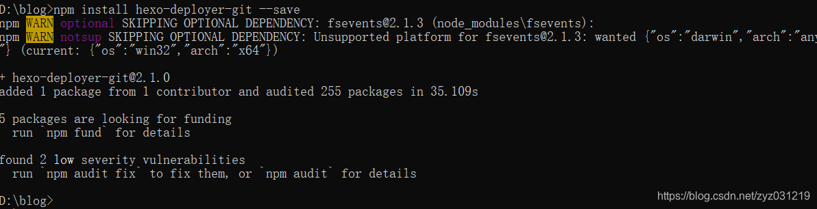 安装部署插件;命令npm install hexo-deployer-git –save
